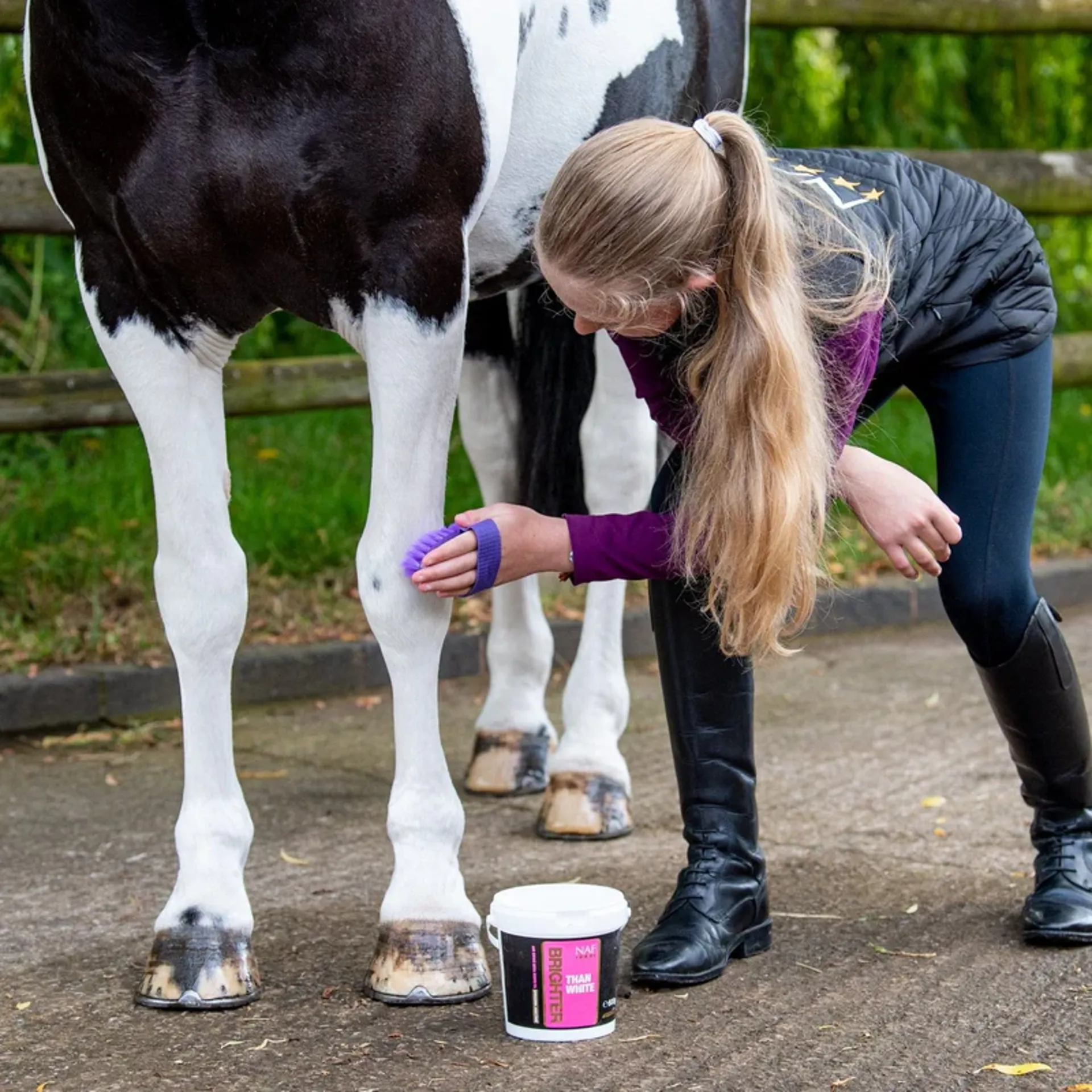 Brighter Than White can be applied directly as a powder or mixed with water to create a paste for more targeted application. Once dry, simply brush off to reveal bright, clean-looking white areas, perfect for competitions or everyday grooming.