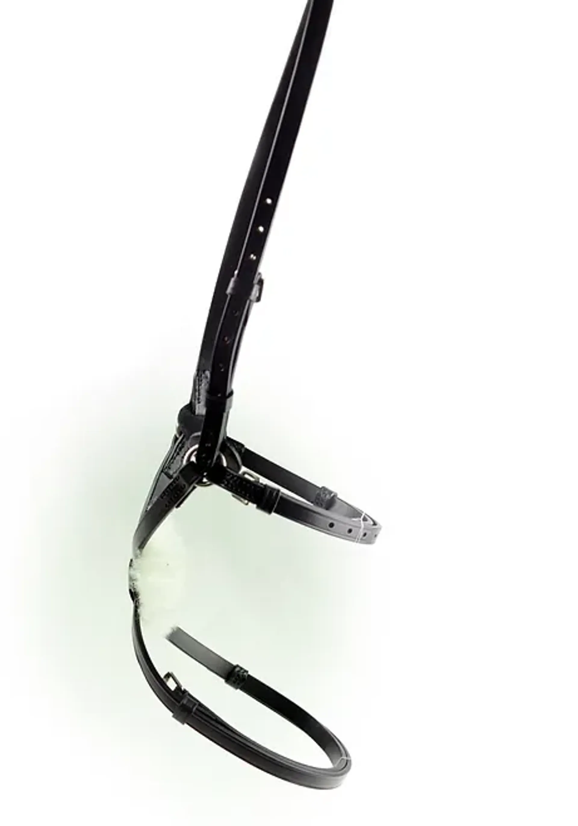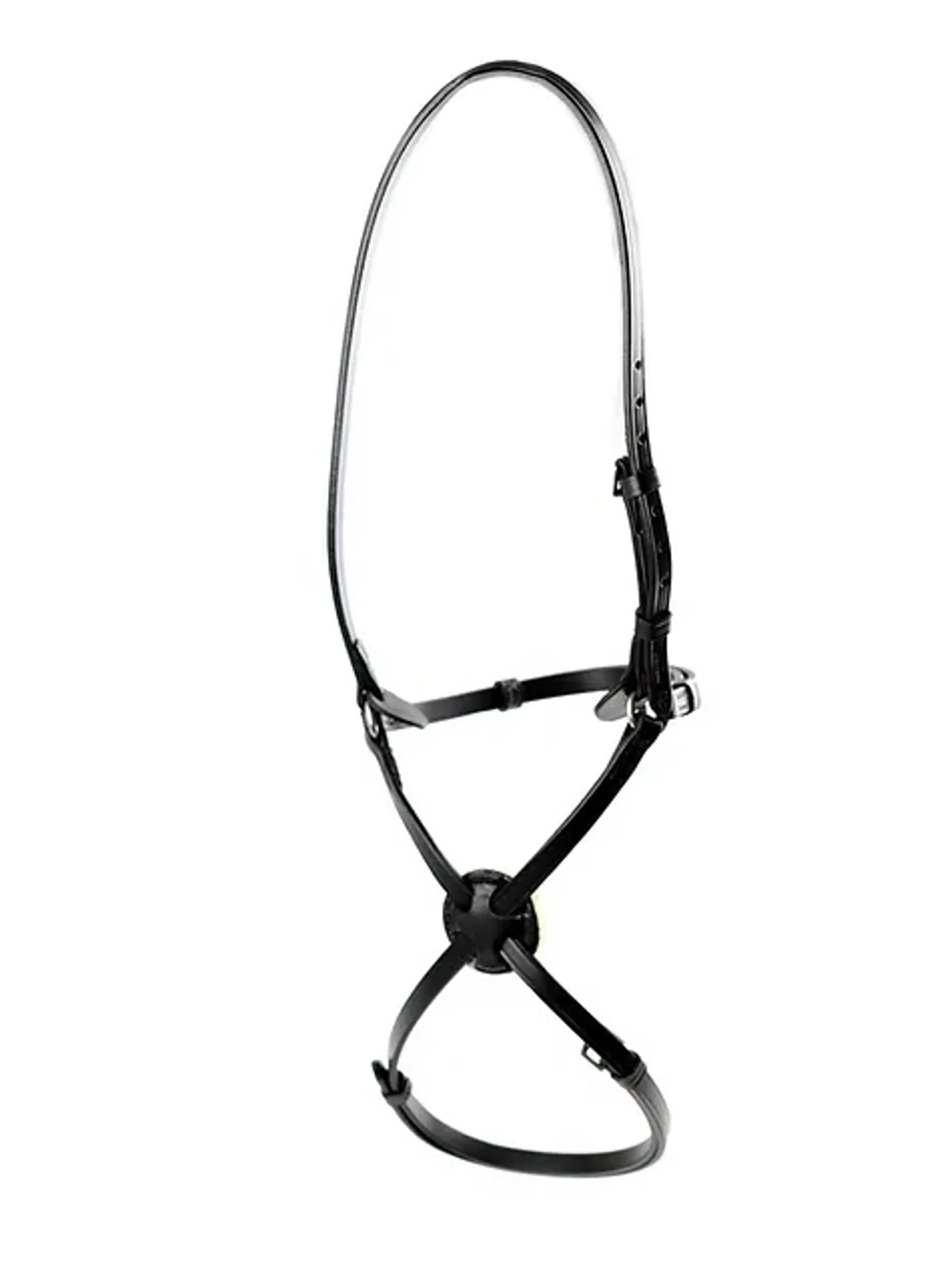 Featuringleather discs behind the rings to help prevent the ring rubbing the cheek bones.It is used to remind the horse to keep its mouth closed and prevents him from crossing his jaw, but provides more expansion of the nostrils, which is preferable for horses performing work involving galloping. Should be fitted higher than a normal Grackle, above the cheek bones.