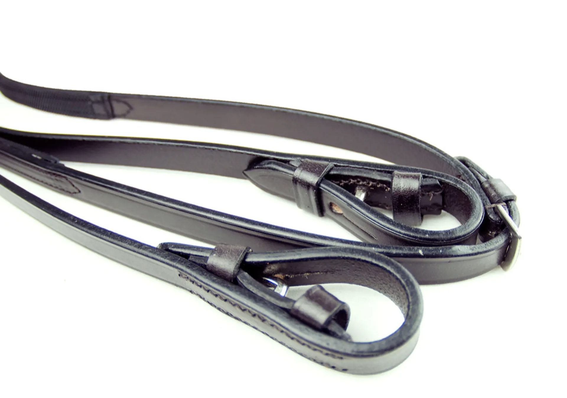 Dever Classic Quality English leather Dressage Reins with stainless steel fittings.A plain leather rein, with a small black pimple rubber grip,only on the inside of the rein. The rubber grip gives extra control, but without the appearance of any rubber. At Dever we only use "Dressage Grip" in black, which has a sealed backing. This ensures no fraying occurs, & being black it is less obvious on both black & dark brown reins. Popular in showing classes or for dressage.